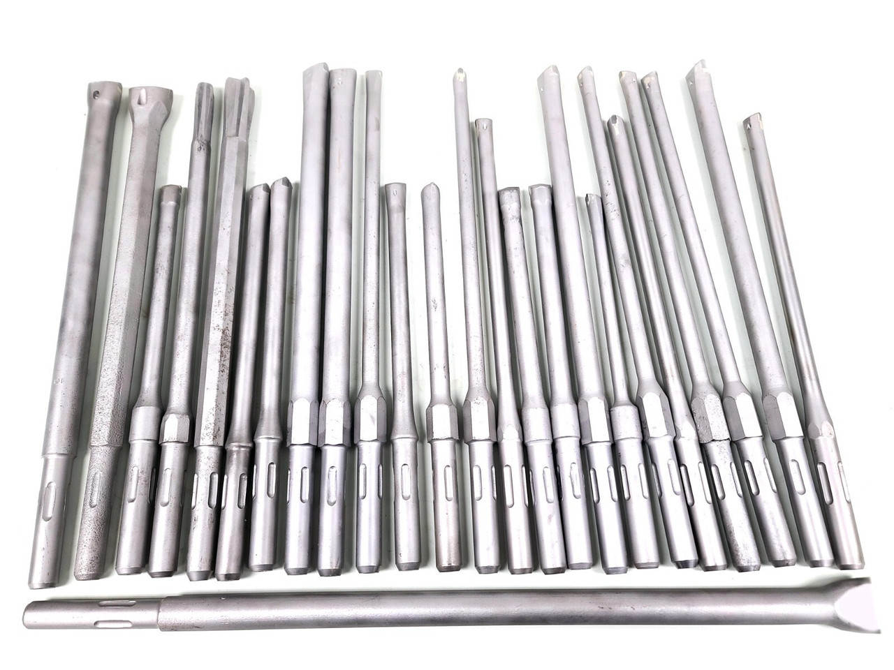 This 25 piece lot of Rock Drill Bits are only slightly used and have been cleaned up and had any surface rust and debris removed. They are all in really good shape and generally sell for over 100.00 per bit in new condition. These bits are all single bladed high carbide tipped with the exception of 2 pieces which have a different type of tip on them. They vary in size and length and the pictures show you both the shank and the tip ends so that you can see they are in really good shape.